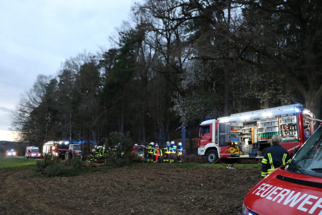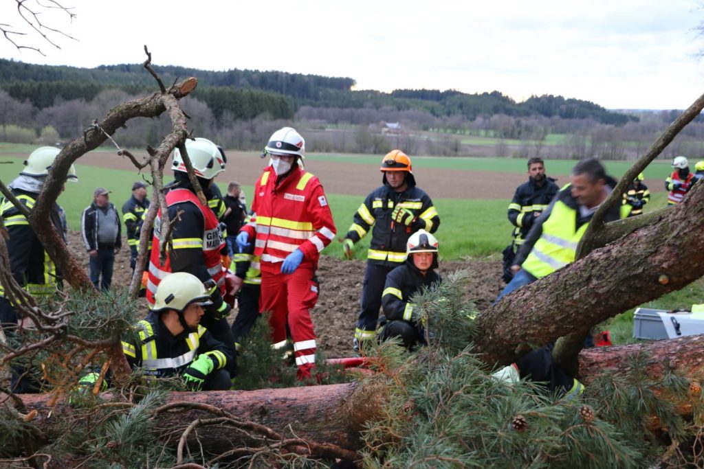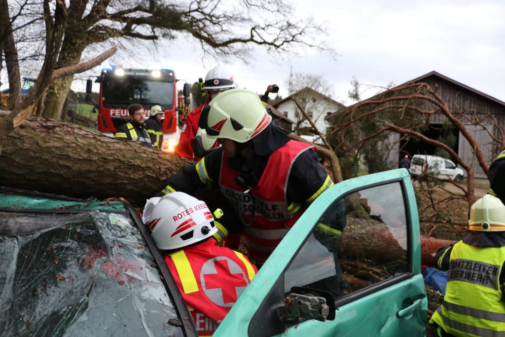 Nach dem Eintreffen am Übungsort wurde sofort mit der Rettung der 3 verletzten Personen und deren Erstversorgung begonnen. Die besondere Schwierigkeit lag bei der Sicherung des Baums, welcher auf dem Dach des Autos lag.