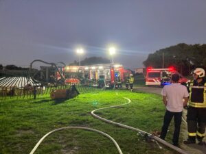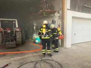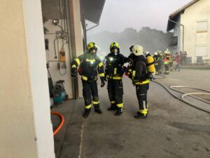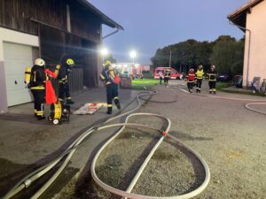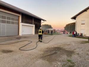 Übungsannahme: In einem Nebengebäude eines landwirtschaftlichen Anwesens war Feuer ausgebrochen und breitete sich rasch aus. 4 Personen wurden im Gebäude vermisst. Die besondere Herausforderung lag neben der Rettung der vermissten Personen in der Löschwasserversorgung. Als besondere Gefahrenquellen befanden sich im Gebäude: mehrere Ölfässer, ein unterirdischer Dieseltank, eine Heizung samt Hackschnitzellager, verschiedene landwirtschaftliche Fahrzeuge und Strohballen am Außenbereich des Gebäudes.