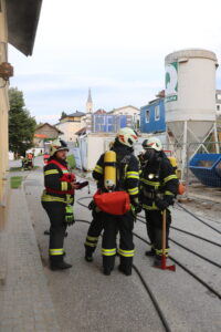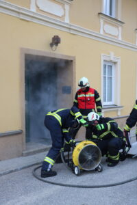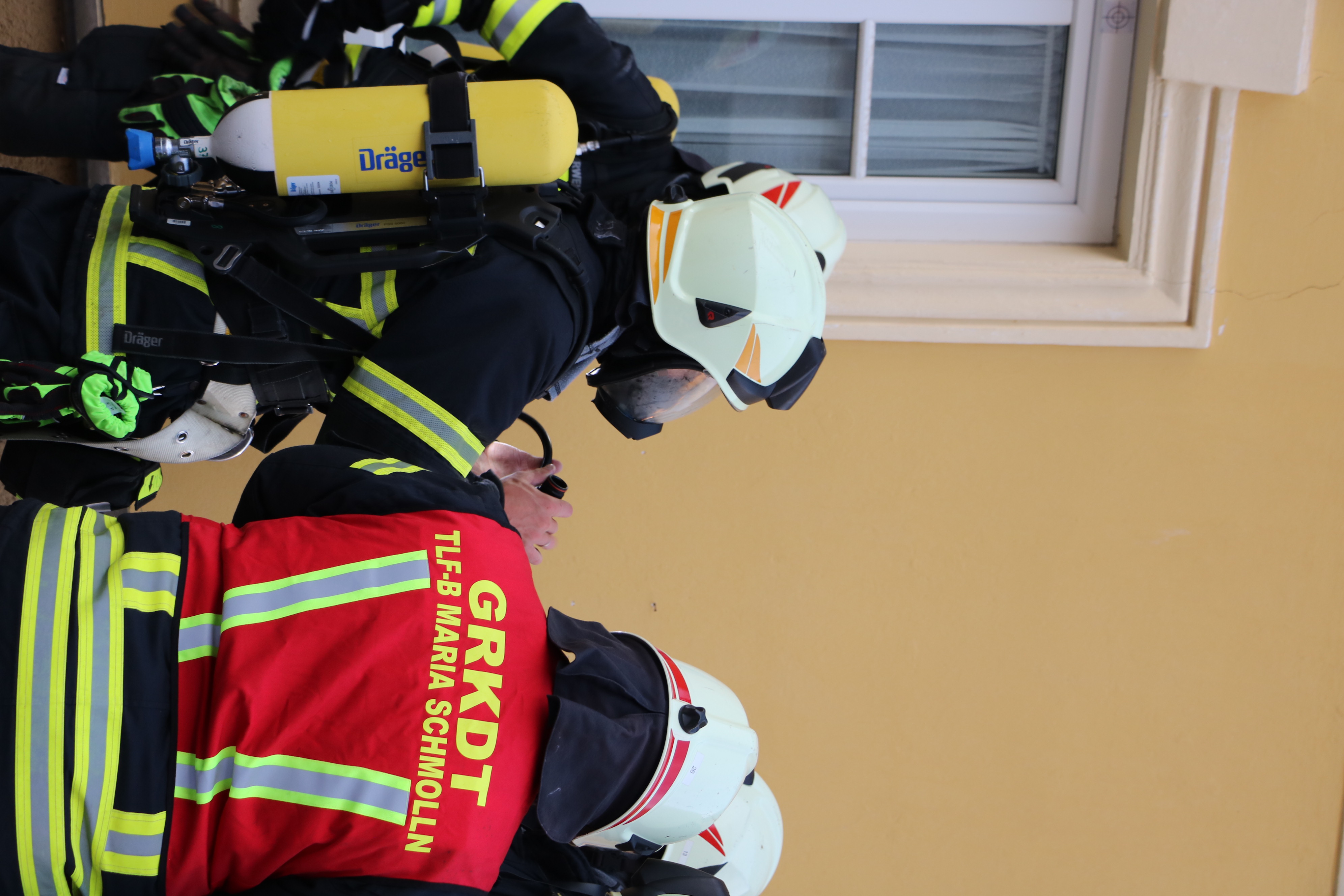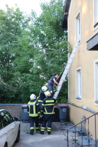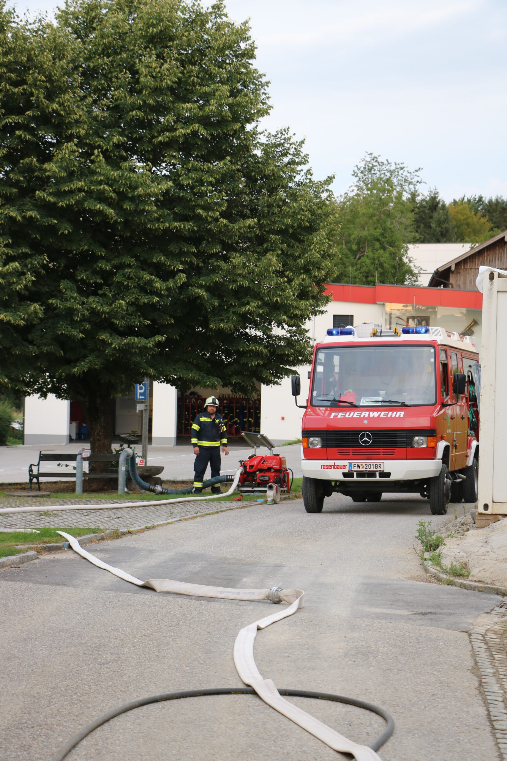 Die erste Übung nach der Sommerpause startetete mit den Stichworten: „Verrauchtes Gebäude, Zimmerbrand vermutet, 3 Personen im Gebäude.“ Eine Person befand sich bewusstlos im Keller des Gebäudes und musste vom Atemschutztrupp gerettet werden, zwei Personen wurden aus dem 1. Stock über eine Leiter gerettet.